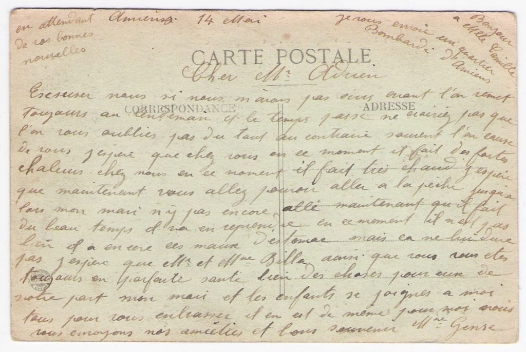 I assume May is May 1919. I don’t remember Ms. Gense sending many postcards, so it must be shortly after the Gense family returned home to Amiens after the war. As a reminder, the Genses were a family from Amiens who, like many families from the north of France, fled to the south when Germany invaded France in 1914, and they spent the war with my grandfather's family before returning home when the war ended.