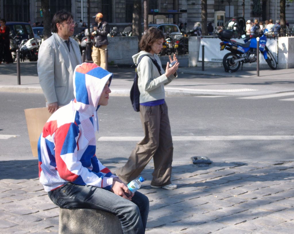 I really like these pictures, especially the one above. They were taken in April 2007 on the Parvis Notre-Dame, right next to the Rue de la Cité. Of course, I don't know anything about this kid. Is he a tourist? I have no idea, but I suspect so. His clothes are a bit too colorful for a Parisian. Maybe he was taking a break while his family visited Notre Dame. Maybe.