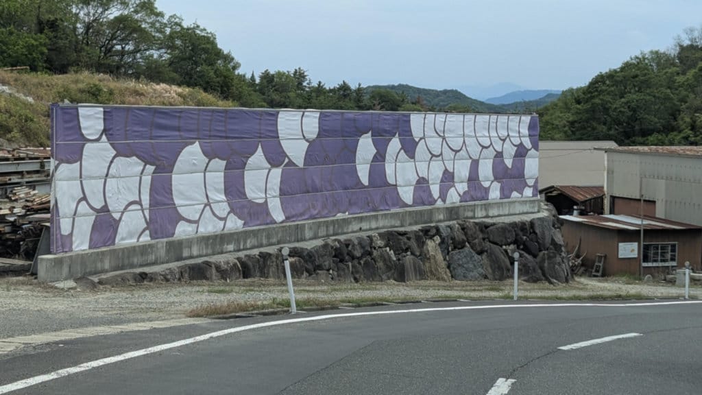 I often wonder what happens to temporary artworks after a Triennale ends. Some are destroyed (including Wang Wen-Chih's bamboo houses, which have a short lifespan by nature, one and a half years at best). Some end up in storage, to be reused at a later date or not. Since most are never reused, I like to imagine a big hangar in Kagawa that looks like the one at the end of Raiders of the Lost Ark. And some artworks have an unexpected second life after the Triennale. I was quite pleased and surprised to see this "tapestry/fence" on the side of the road.