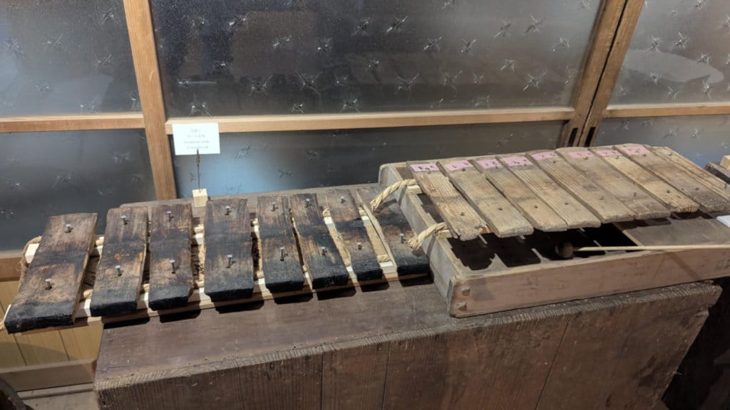 The interior of the building was full of improbable musical instruments made from all sorts of rural tools, some very old and some not that old (for example the somen-making machines).