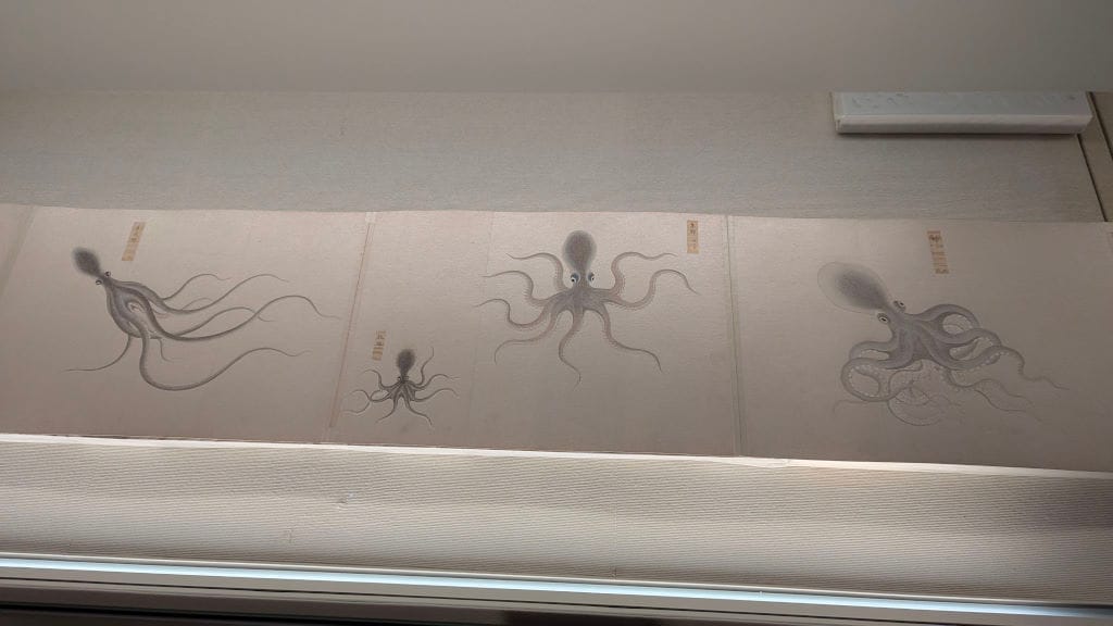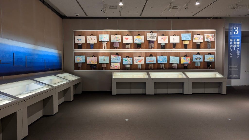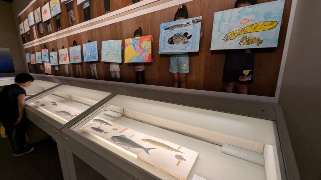 This is probably my favorite part of the exhibit. There are some very precise and scientific drawings of the fish found in the Seto Inland Sea, and above them drawings of the same fish by children.
